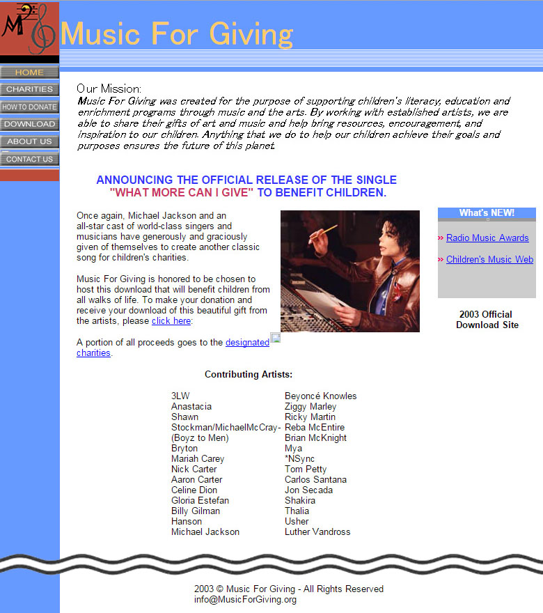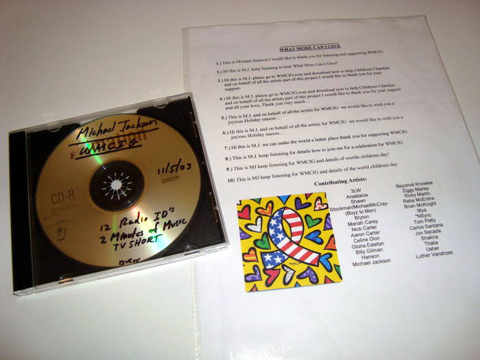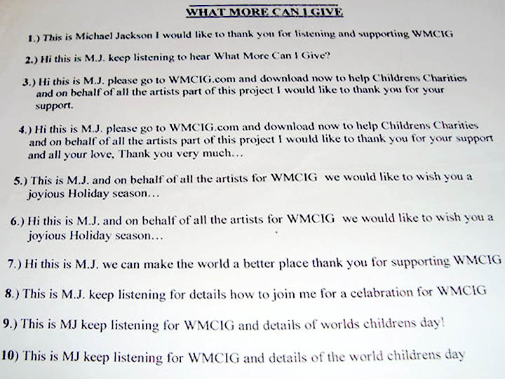 | 1) This is Michael Jackson. I would like to thank you for listening and supporting WMCIG. 2) Hi, this is Michael Jackson. Keep listening to hear What More Can I Give? 3) Hi, this is Michael Jackson. Please go to WMCIG.com and download now to help Childrens Charities and on behalf of all the artists part of this project I would like to thank you for your support. 4) Hi, this is Michael Jackson. Please go to WMCIG.com and download now to help Childrens Charities and on behalf of all the artists part of this project I would like to thank you for your support and all your love. Thank you very much... 5) This is Michael Jackson, and on behalf of all artists for WMCIG. We would like to wish you a joyious Holiday season... 6) Hi, this is Michael Jackson, and on behalf of all artists for WMCIG. We would like to wish you a joyious Holiday season... 7) Hi, this is Michael Jackson. We can make the world a better place thank you for supporting WMCIG. 8) This is Michael Jackson. Keep listening for details how to join me for a celabration for WMCIG. 9) This is Michael Jackson. Keep listening for WMCIG and details of worlds childrens day! 10) This is Michael Jackson. Keep listening for WMCIG and details of the world childrens day |