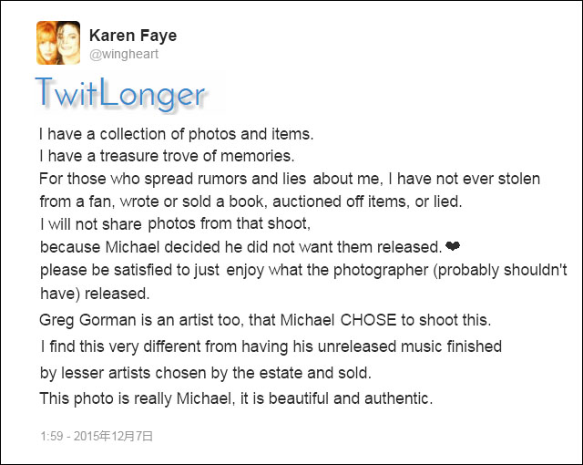 私は、写真やアイテムのコレクションを持っています。思い出の宝庫を持っています。 私の噂を広めたり嘘をつく人々に対し、私はこれまでにファンから盗んだり 本を書いたり売ったり アイテムをオークションにかけたり 嘘をついたりした事はありません。 私がその写真たちを (積極的に)シェアしたりしないのは、マイケル自身がそれらを公開したくないと決めたからです。 どうか、フォトグラファーによる (本来は不当所持の)公開を楽しみ満足して下さい。 どうか、フォトグラファーが公開した(たぶんしないほうが良かったであろう)モノを楽しむことで満足してね。 グレッグ・ゴーマンは、マイケルがこの撮影に選んだ芸術家です。 MJエステートが選んだ小物アーティストによって仕上げられ販売されたマイケルの未発表曲とはわけが違うと 私には解ります。 この写真は真にマイケルです。とても美しい本物です。
