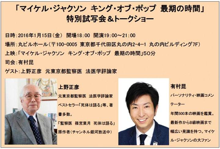 チャンネル銀河主催の、検死レポート番組マイケル回の特別試写会&トークショーのインフォは