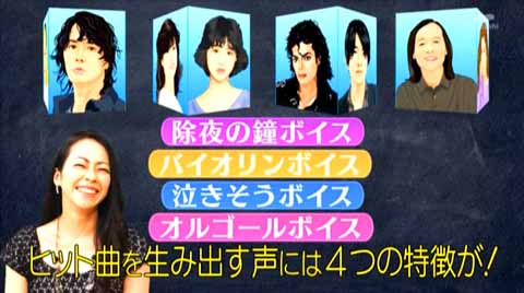 『除夜の鐘ボイス』,『バイオリンボイス』,『泣きそうボイス』,『オルゴールボイス』「かなり普遍的に愛される色あせない歌手にはどんな特徴があるかを分けるクイズです!」
