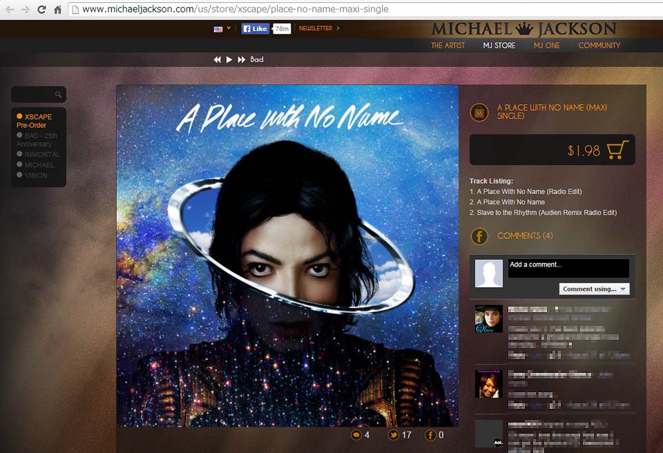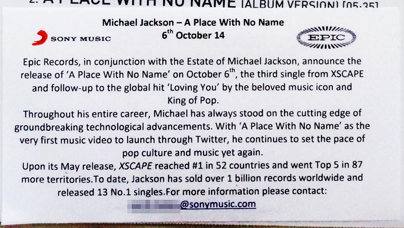 | Epic Records, in conjunction with the Estate of Michael Jackson, announce the release of "A Place With No Name" on October 6th, the third single from XSCAPE and follow-up to the global hit "Loving You" by the beloved music icon and KING OF POP. Throughout his entire career, Michael has always stood on the cutting edge of groundbreaking technological advancements. With "A Place With No Name" as the very first music video to launch through Twitter, he continues to set the pace of pop culture and music yet again. Upon its May release, XSCAPE reached #1 in 52 countries and went Top 5 in 87 more territories. To date, Jackson has sold over 1 billion records worldwide and released 13 No.1 singles. For more information please contact: xxxx@xxxx |
